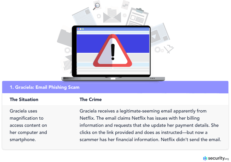 Plenty of people, including folks with poor vision, get fooled by these emails every day. A person such as Graciela is not always able to see or judge an email in its entirety. Similarly, Graciela may be so focused on one aspect of an email that another part slips her attention. To prevent mistakenly giving out your information:
