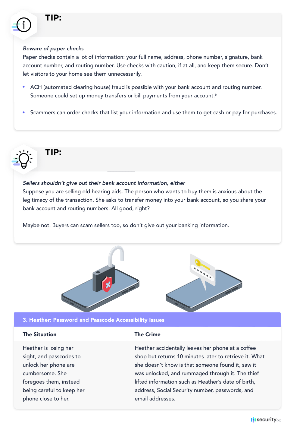 Secure your computers and mobile devices with biometrics, passcodes, or other digital locks. Keep birth certificates, Social Security cards, passports, checkbooks, and other sensitive documents in protected locations such as lockboxes. Be extra careful around holidays or if you have multiple people in and out of your home.