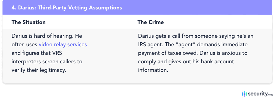 It’s up to consumers themselves to determine if something seems fishy. An interpreter or communications assistant won’t interject with something like, “Hey, you really shouldn’t give out your bank account number,” or, “I’m skeptical if you’re actually an IRS agent.”