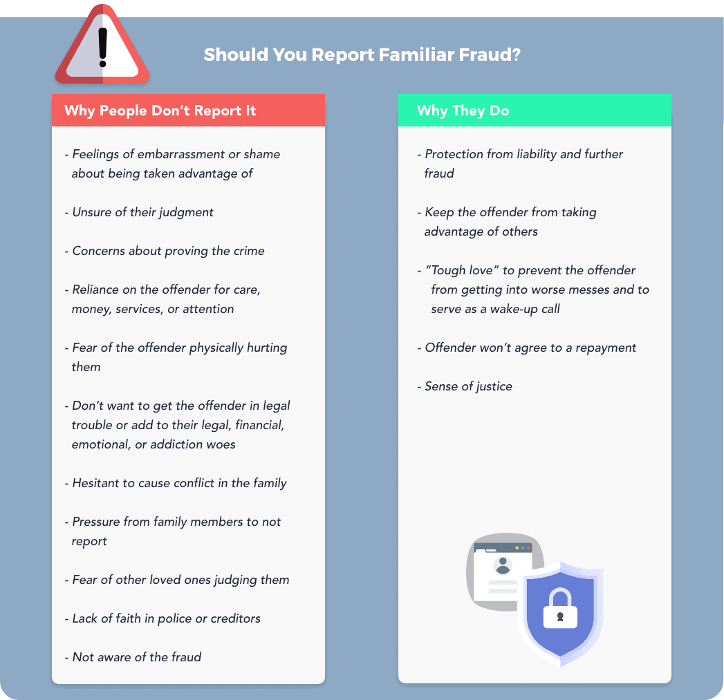 The more people who have access to sensitive information, the higher the risk of theft or fraud. Love and trust are major reasons familiar fraud is underreported, overlooked, or plain ignored. It’s hard to inform your mother that your father has been stealing from her for years, or to tell your grandfather that your sister has stolen his identity.