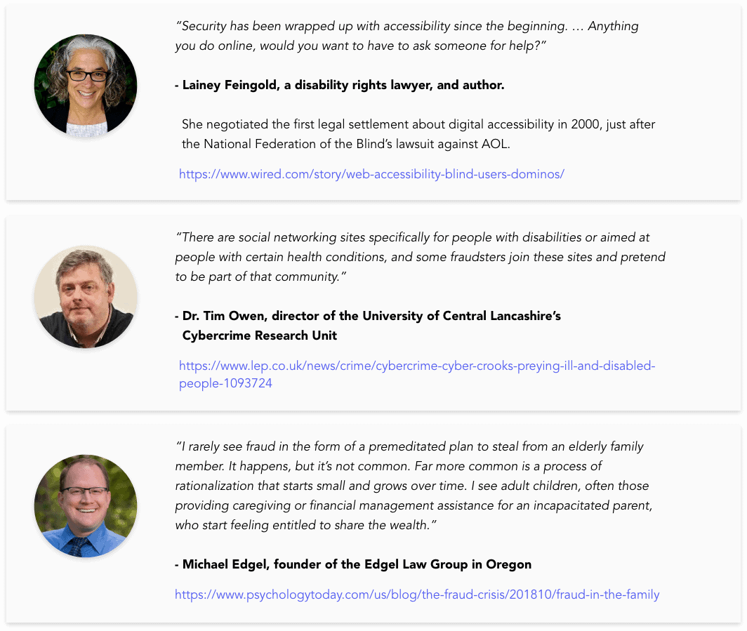The digital world is far from 100% accessible, even after the 2018 Department of Justice ruling that required websites to meet ADA requirements with guidelines on how to become ADA compliant following in 2022. Yet, many people still struggle to access basic governmental services to file for taxes, register to vote, and get important records. When someone has to sacrifice their privacy or depend on another person’s assistance, they face a significantly higher risk of exploitation, fraud, and theft.