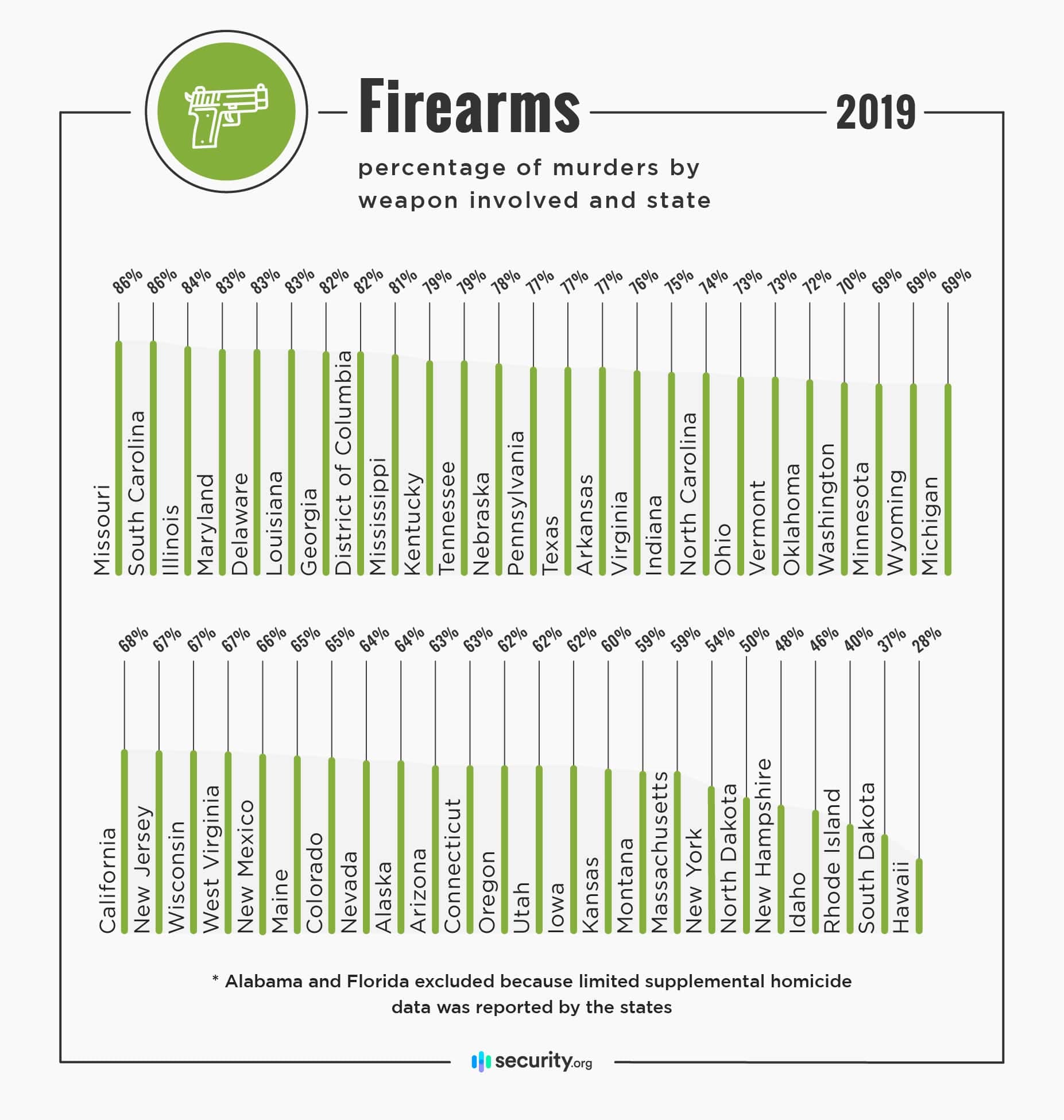 In addition to major variations in how common murder is in each state, different areas of the country vary in the types of weapons most often used in murders. Again, about 74 percent of murders nationally involved the use of firearms; such weapons range from about 28 percent of murders in Hawaii to 86 percent in Missouri and South Carolina.