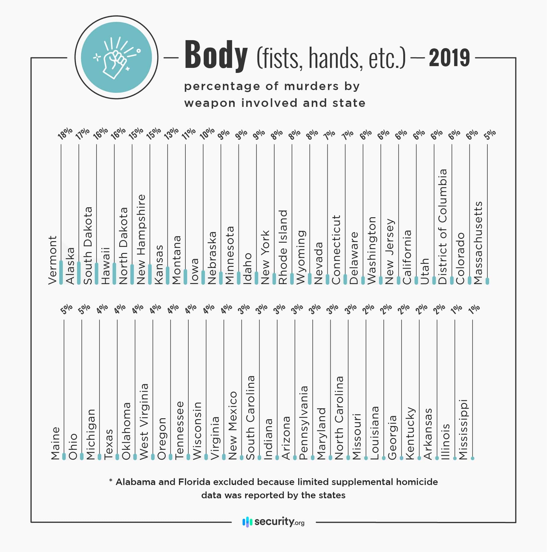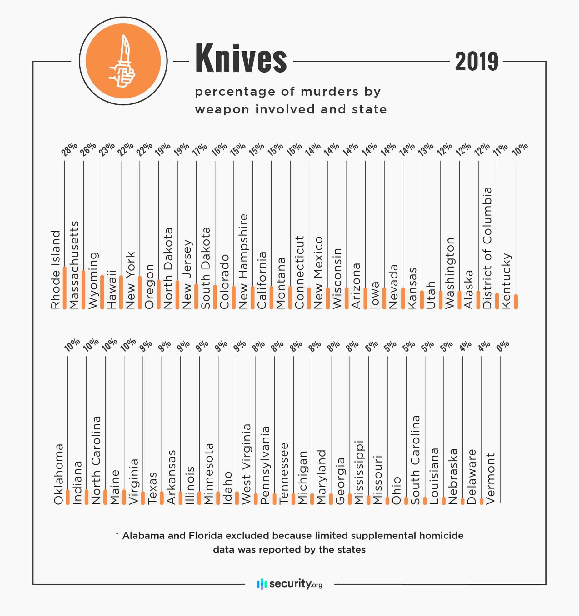 At the same time, about 11 percent of murders involved knives in the U.S. in 2019, but they accounted for 28 percent of Rhode Island’s murders. One potential reason why Rhode Island has a relatively low rate of murders involving guns is the state’s gun control laws, which have high marks from organizations like the Giffords Law Center.9