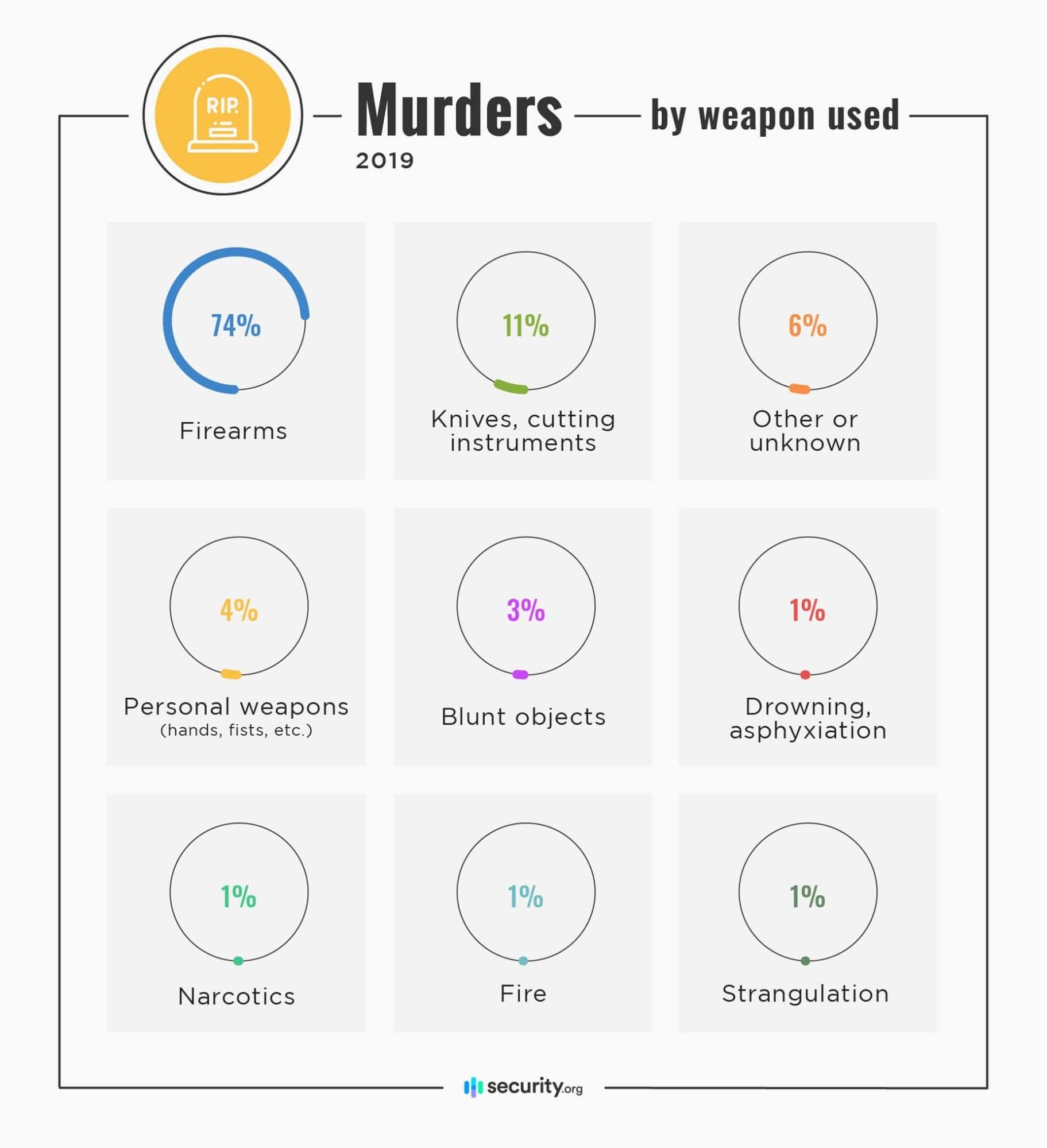 In 2019, nearly 3 in 4 murders in the U.S. involved firearms, by far the most common type of weapon used to commit murder.